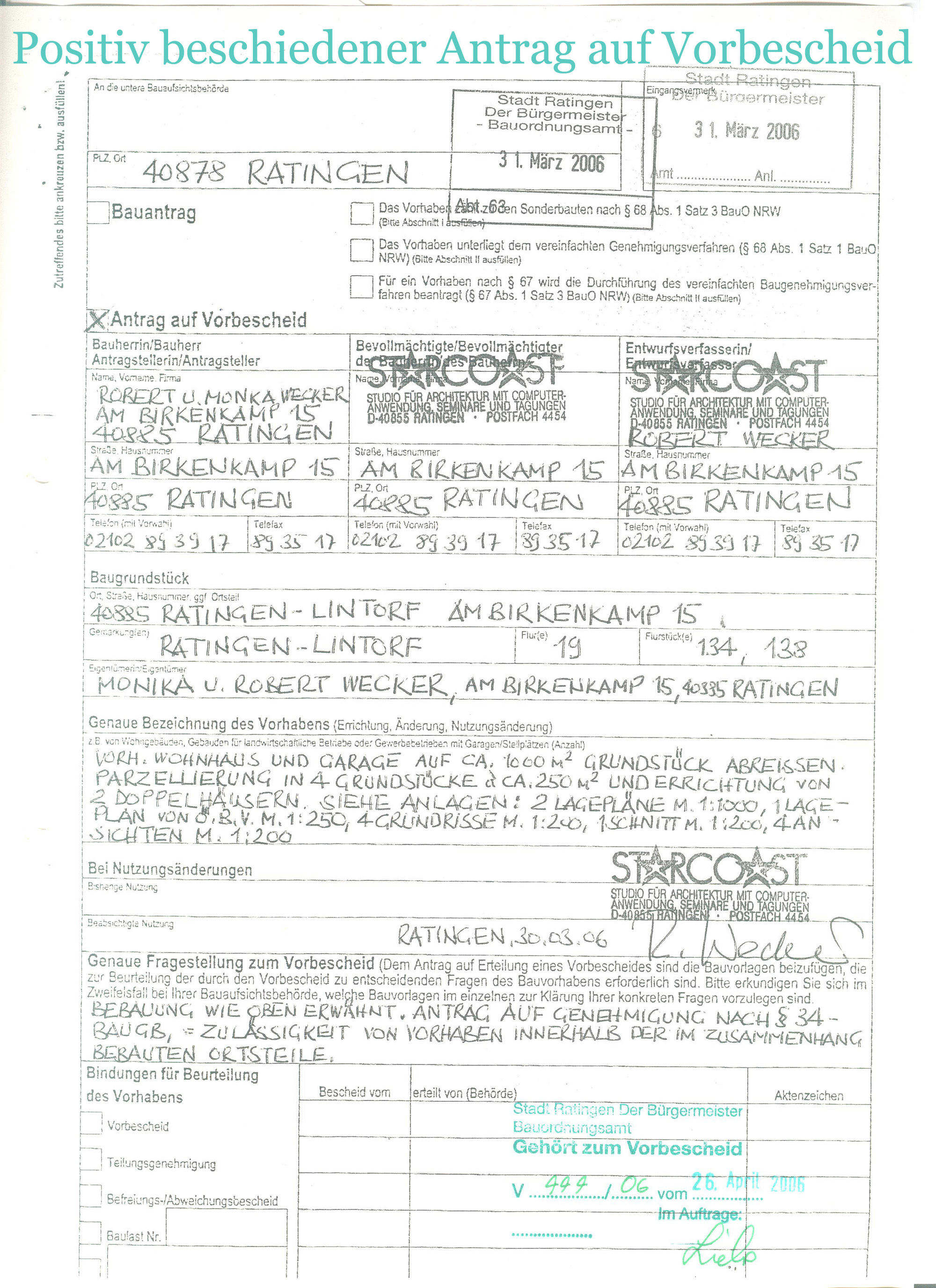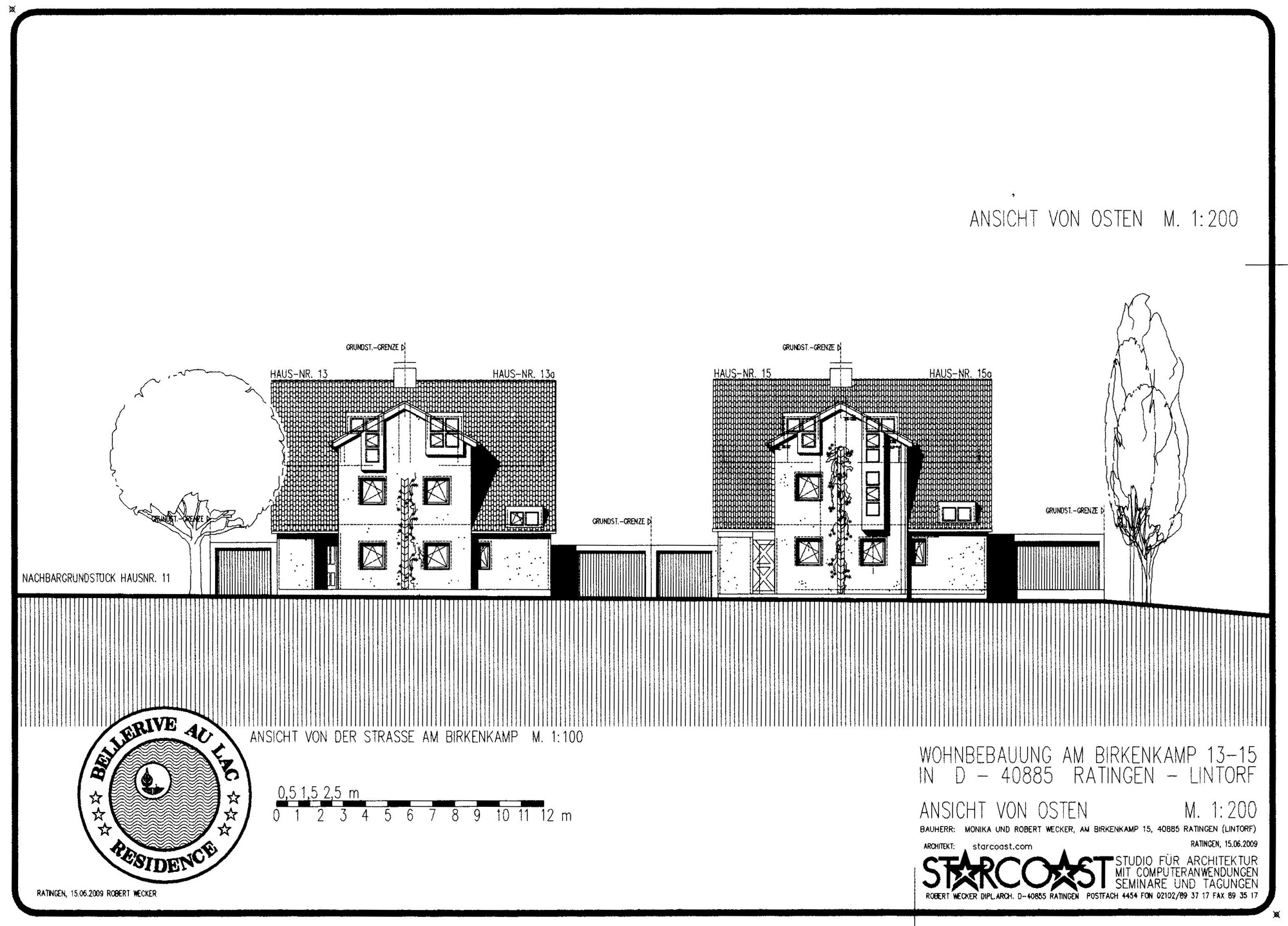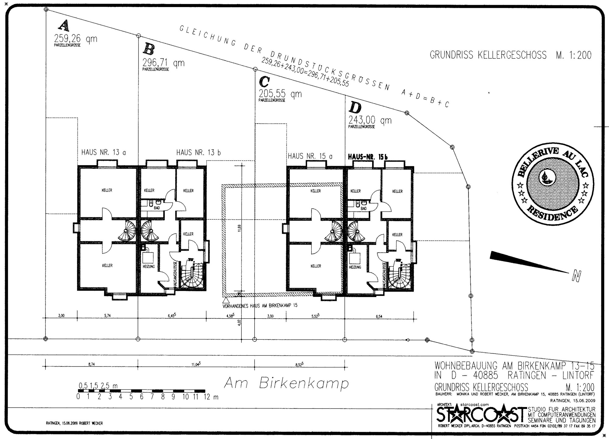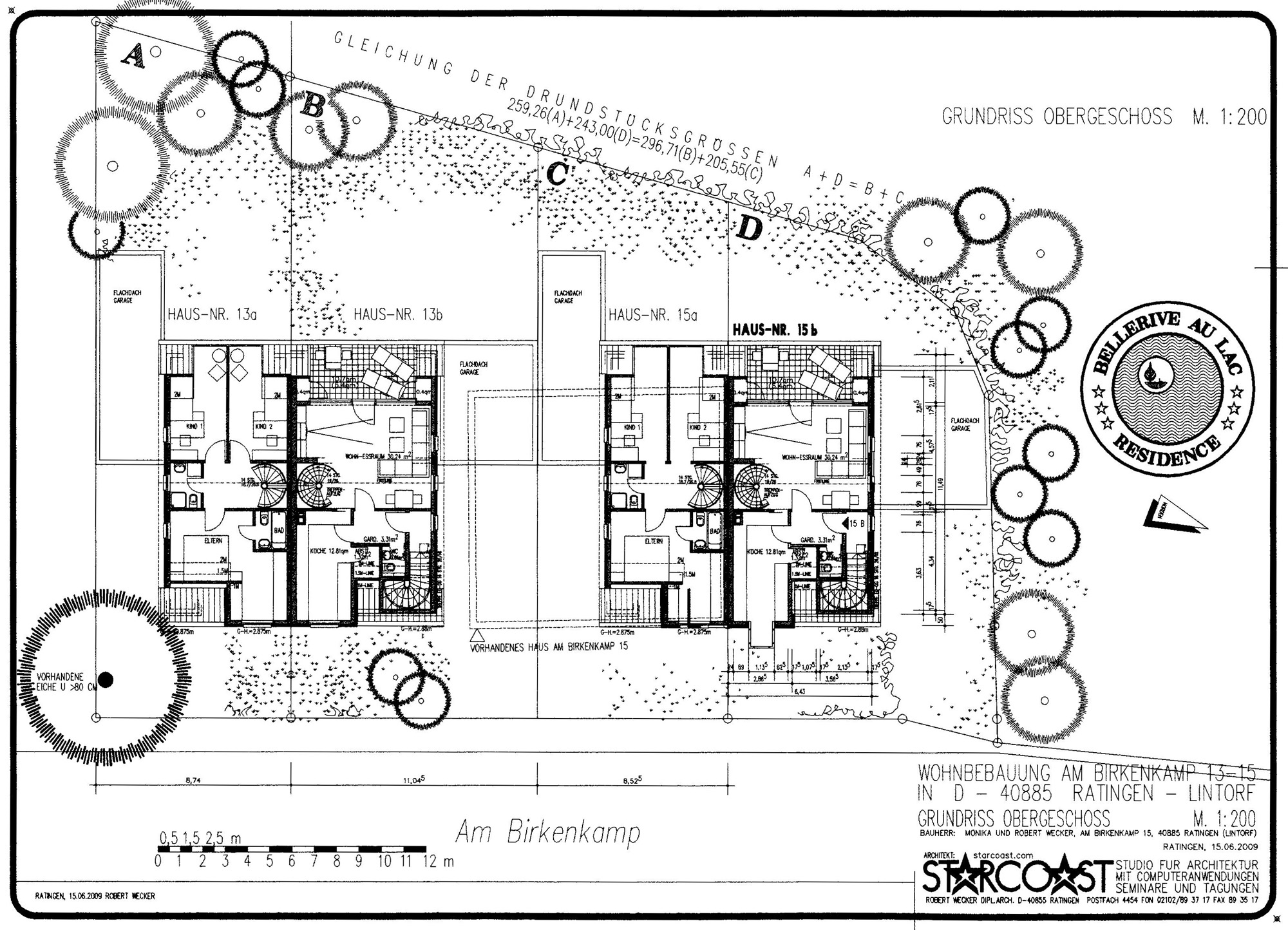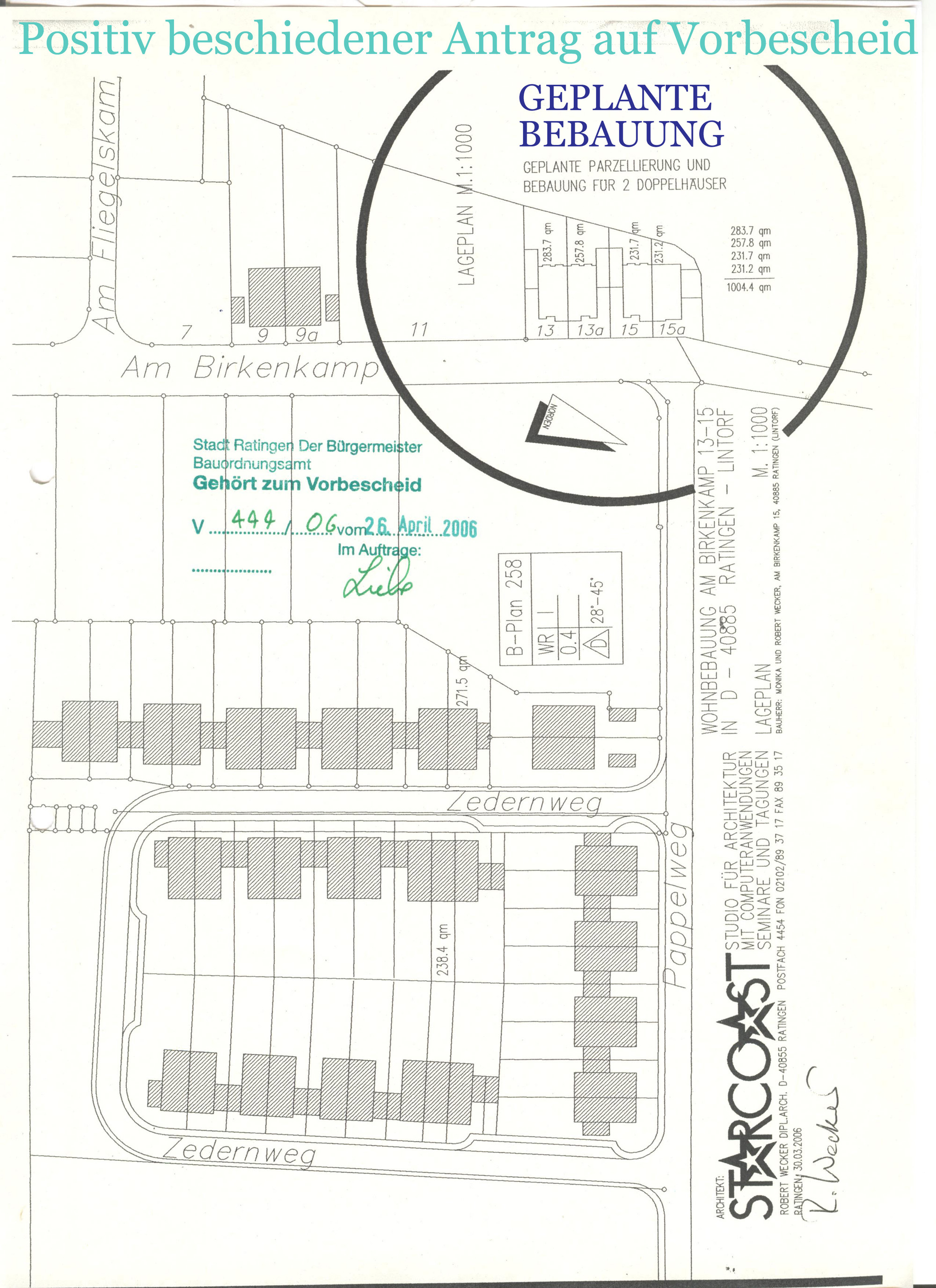Wohnbebauung für Familie Robert Wecker4 DoppelhaushälftenAm Birkenkamp 13a, 13b, 15a und 15b in D-40885 Ratingen - Lintorf am Waldsee- Bauvoranfrage April 2006 -